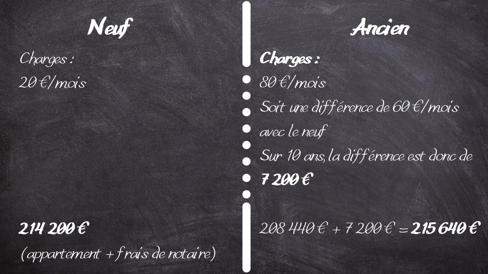 Pour l'ancien = 208 440 € + 7 200 € de différence de charges sur 10 ans = 215 640 €